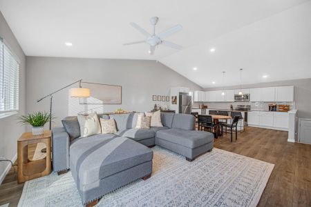 Spacious living room with sliding glass doors leading to back deck